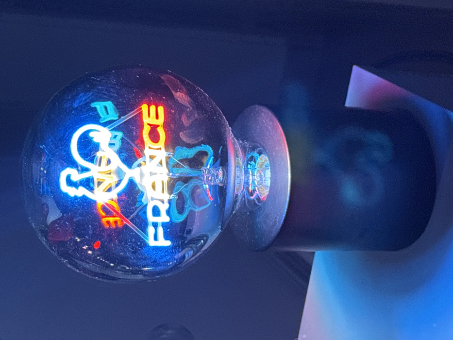 - "A glass lightbulb displays the word "PRINCE" in bright neon colors" by FM-4BMmE2, licensed under CC BY 4.0
