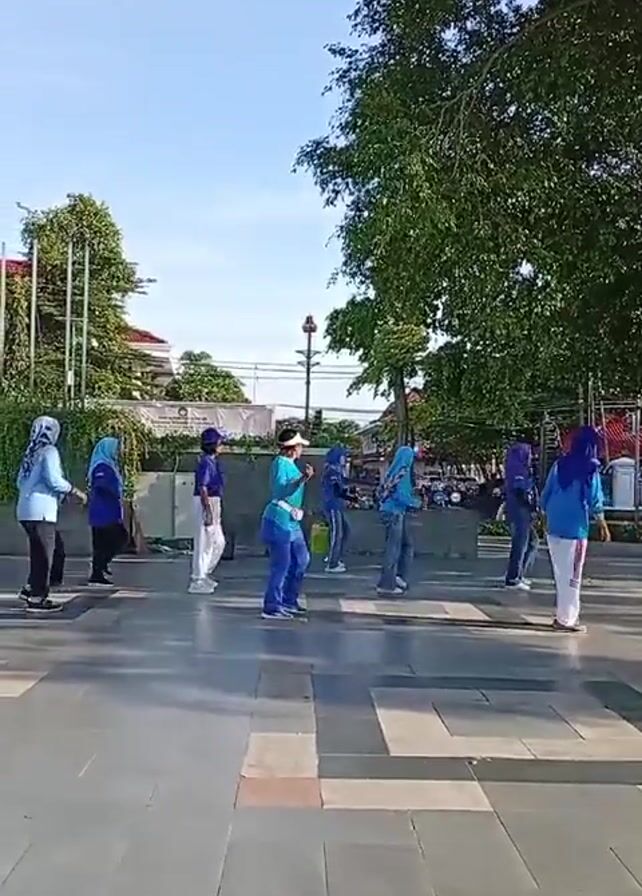 A group of about ten women are line dancing on a paved plaza in a park on a bright, sunny day