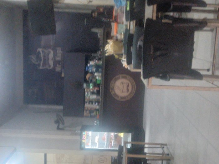 café or coffee shop interior. A dark-colored wall features a coffee cup graphic and lettering, possibly a brand name. A counter displays various bottles and supplies. A glass-fronted refrigerator unit sits beneath a fan. Chairs and tables are scattered around, suggesting a seating area for customers. The floor appears tiled. Overall, the photo depicts a simple, functional commercial space.