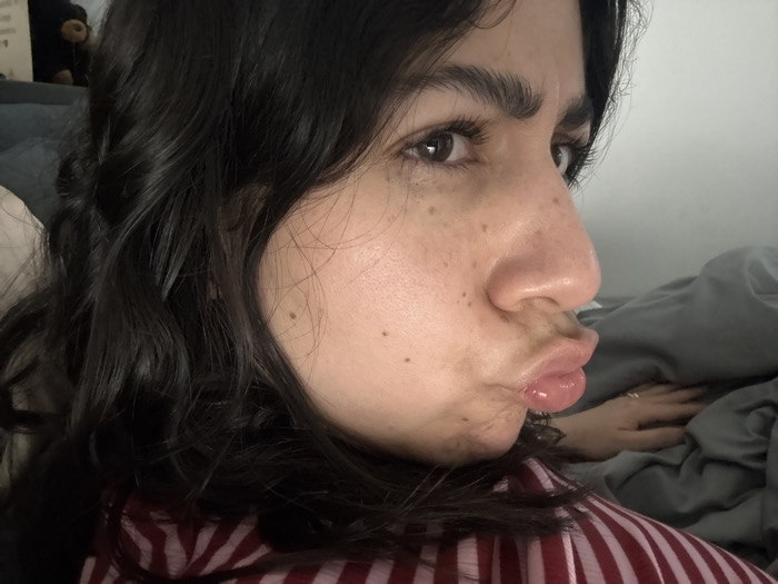 - "A woman with dark, wavy hair and fair skin poses in a close-up shot, puckering her lips towards the camera" by FM-rSR2K3, licensed under CC BY 4.0