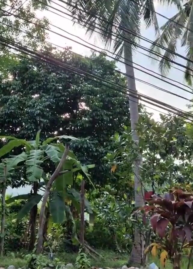 shot of lush, tropical vegetation in an outdoor setting. Banana trees, palm trees, and other plants fill the frame. Electrical wires stretch across the sky. A man wearing a tan shirt and blue shorts walks along a cracked and patched road in the distance.