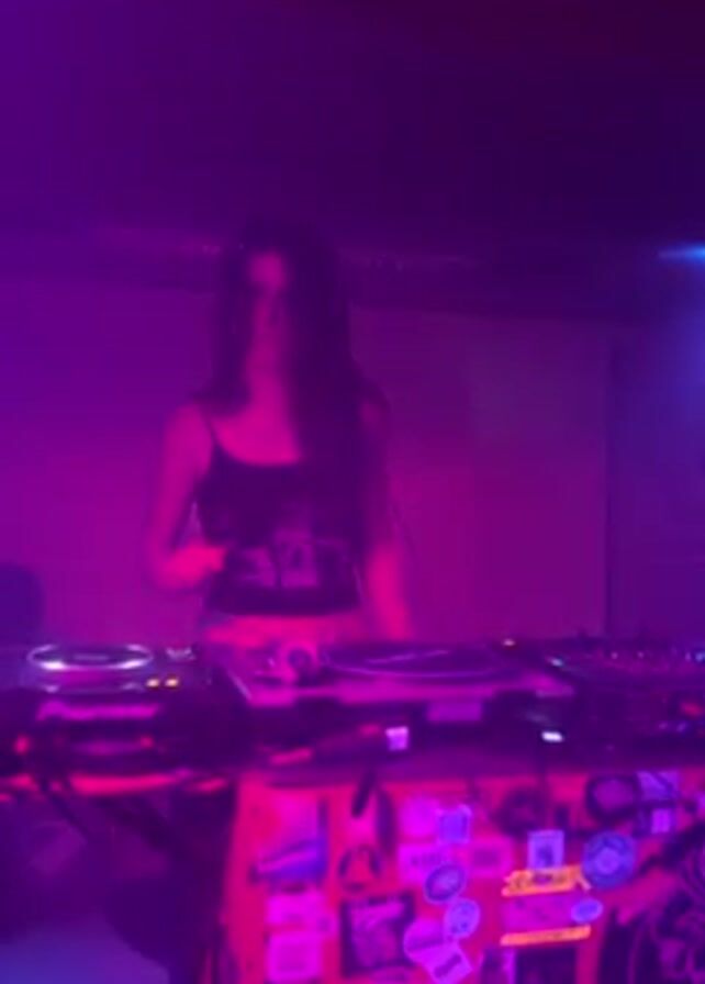 A woman DJs in a dimly lit room, bathed in purple light. The woman wears a black tank top and is facing the viewer. She's operating a DJ setup, with a Pioneer mixer and turntables visible. The DJ booth is decorated with numerous stickers. In the background, a white screen displays blurry images. The woman adjusts her headphones and then touches one of the turntables. Music can be heard throughout.