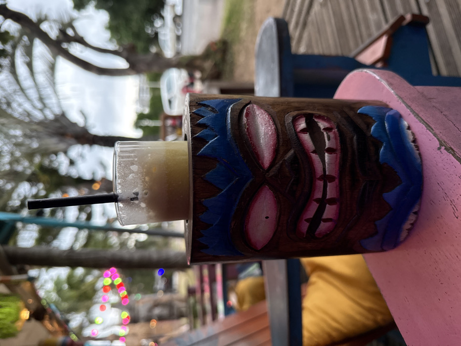 A wooden tiki mug, carved with an aggressive, stylized face featuring dark brown wood, prominent pinkish-red eyes, and a wide mouth with visible teeth, sits on a chipped pink wooden surface. Blue accents are present at the top and bottom of the mug. A clear, cylindrical glass containing a light yellow, frothy beverage, approximately two-thirds full, is inserted into an opening at the top of the tiki mug. A thin black plastic straw protrudes from the drink. The scene is set in an outdoor or semi-outdoor area within the city of Noumea, France. The background is out of focus, revealing string lights with multi-colored bulbs (red, green, blue, pink) to the upper left. A blurred, colorful wooden Adirondack-style chair with a yellow cushion is visible to the lower left. To the right, blurred green foliage, including palm trees, partially obscures a street where a white vehicle is visible. The sky is overcast. No individuals are discernible within the frame.