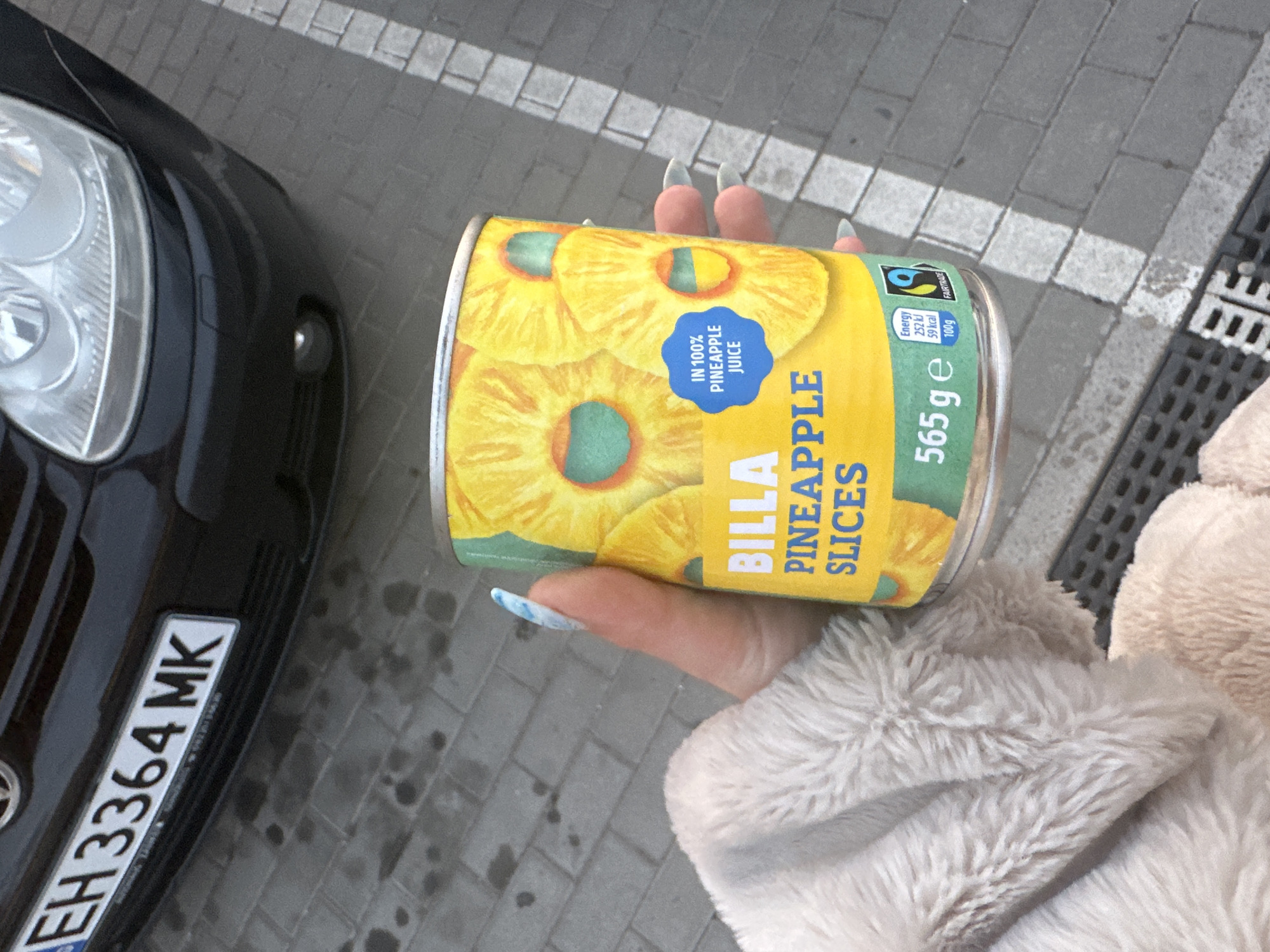 The image presents a close-up, downward-angled view of a person's hand holding a can of Billa Pineapple Slices outdoors. The hand has light-toned skin and long, pointed fingernails adorned with a blue and white marbled design. The person's left forearm, clad in a light-colored, fuzzy garment, is visible in the lower-left quadrant. The can's label is predominantly yellow and green, displaying "BILLA PINEAPPLE SLICES," "IN 100% PINEAPPLE JUICE," and "565 g e," along with Fairtrade certification and nutritional information (252 kJ / 59 kcal per 100g). In the background, a dark-colored vehicle, likely black, is partially visible. Its front bumper prominently displays a Bulgarian license plate, "EH 3364 MK," indicating the location is Vratsa, Bulgaria. The vehicle's headlights and a fog light are also discernable. The ground is paved with grey interlocking concrete pavers, showing scattered wet spots. A metal drainage grate is partially visible in the lower right and center of the frame. Strong shadows are cast on the pavement, suggesting a sunny outdoor environment.