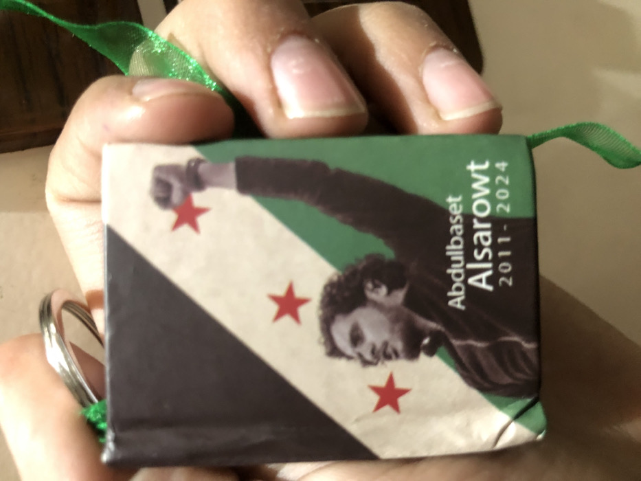 A person's right hand holds a small, rectangular object, identified as a commemorative keychain or pendant, in Kafr Sousa Municipality, Syria