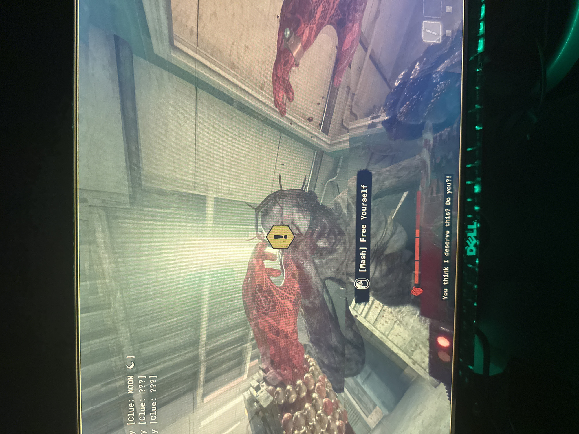 The image is a photograph of a computer monitor displaying a video game, taken from an upward angle. The central subject on the screen is a humanoid-like creature with dark, stringy hair or features and multiple sharp, needle-like protrusions emanating from its head. This creature is flanked and apparently restrained by two large, red, scaly, monstrous arms or appendages; the left arm exhibits bulbous, textured growths, while the right arm extends towards the central figure. A hexagonal yellow warning icon containing an exclamation mark hovers near the central figure's head. Below the creature, a game interface prompt reads "[Mash] Free Yourself," accompanied by a red health bar featuring a heart icon and the overlaid text, "You think I deserve this? Do you?!". In the top-left corner of the game display, partial user interface text includes "y [Clue: MOON C]". The game's environment appears as a dimly lit, interior space, possibly industrial or dilapidated, characterized by visible metallic structures and a prominent green light source emanating from above the central figure. Below the monitor, a portion of a keyboard with green backlighting is visible, with the "DELL" logo distinctly displayed on its palm rest. The depicted content is a fictional video game environment and does not represent a real-world location in Sofia, Bulgaria.