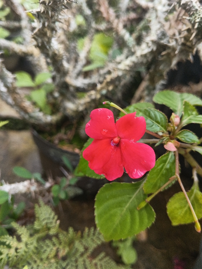 A vibrant red flower, with four distinct petals, is the focal point. Its color contrasts with the surrounding green leaves. The plant appears to be set against a backdrop of a thorny, cactus-like shrub, with a grayish-brown color. The overall composition is tightly framed, emphasizing the flower and its immediate environment.