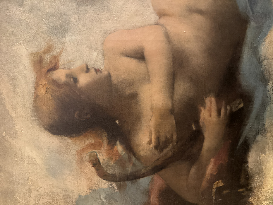 The image is a photograph of a detail from the painting "A Young Woman with a Serpent" (also known as "Psyché") by William-Adolphe Bouguereau, located at the Musée d'Orsay in Paris, France