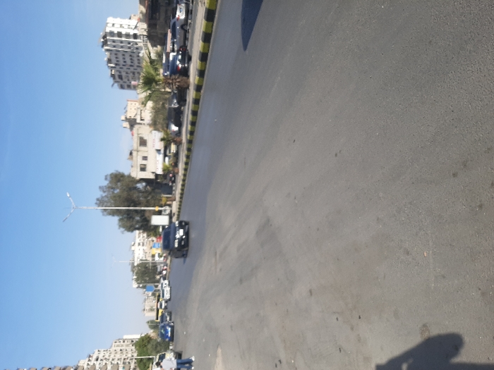 The image depicts a wide urban street within Barza Municipality, Syria, under a clear blue sky during daylight hours. The asphalt road surface, appearing dry, shows minor marks and debris. It features multiple lanes divided by a median strip painted with alternating black and yellow stripes. Vehicular traffic is present, with a dark-colored sedan (possibly a BMW) prominent in the middle-right lane, moving away from the camera. Several other vehicles, including sedans and SUVs of various colors (blue, silver, black), are visible further down the road and parked along the right side adjacent to commercial structures. On the far left sidewalk, at least two individuals are visible; one person wearing light-colored trousers and a dark top is partially obscured, facing away from the camera. The shadow of the photographer is cast into the bottom-left foreground. Buildings line both sides of the street. On the left, a tall, multi-story residential building with numerous balconies dominates the immediate background. On the right, a series of lower-rise buildings, consistent with commercial ground floors and upper-level residences, are visible, interspersed with trees and palm trees. Further in the background, additional multi-story urban structures are present. Street infrastructure includes a tall lamppost with multiple light fixtures on the median strip and a blue rectangular sign. Shadows indicate bright sunlight, suggesting a mid-morning or early afternoon time.