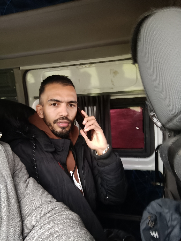 n adult male inside a vehicle, likely a van or minibus. The specific location in the city of Majjate, Morocco, cannot be determined from the visual information provided. The man, positioned centrally and facing the camera, has short dark hair, a beard, and a mustache. He wears a dark, possibly black, puffer-style jacket over a brown hooded sweatshirt featuring a white graphic on the chest. He is holding a black smartphone to his right ear with his right hand, indicating he is on a phone call. A silver-colored bracelet is visible on his right wrist. To the left of the man, a grey, textured fabric, possibly clothing or upholstery, is visible. The vehicle interior features a white paneled ceiling and a window on the right side, covered by a dark reddish-brown curtain or lining. A grey mesh headrest of a seat is partially visible in the foreground on the right, with a dark blue bag or object beneath it.
