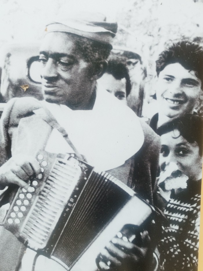 A black and white photograph shows a man playing an accordion, with a group of people standing behind him
