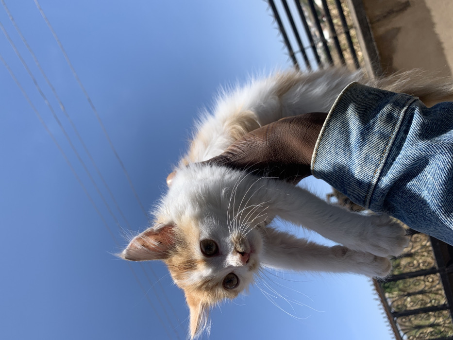 - "A concise forensic description of the scene in Jos, Nigeria, shows a small, fluffy domestic cat held aloft by a human hand under a clear, bright blue sky" by FM-BqndE3, licensed under CC BY 4.0