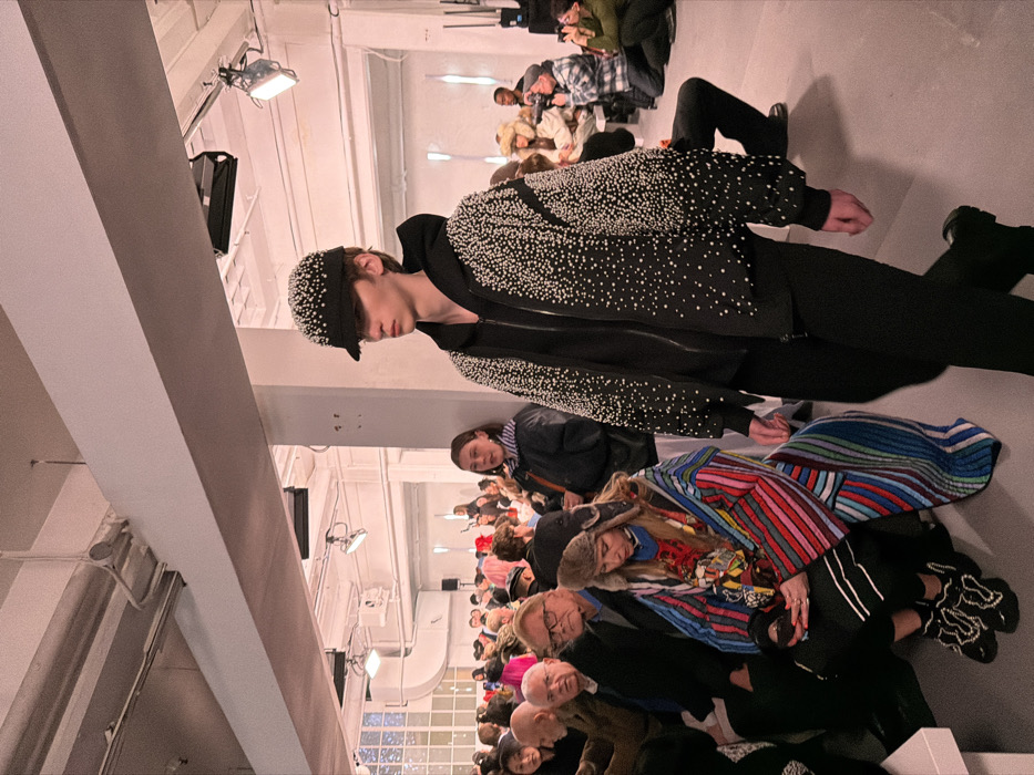 A fashion show audience sits along a runway. Many people are crammed together in rows of seating. A model walks by, wearing a black outfit with white beaded embellishments. The room has a stark, industrial feel with white walls and visible support beams. The audience members wear a variety of clothing. The overall scene suggests a fashion event with a focus on a specific designer or collection.
