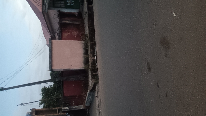 The image displays an urban street scene in Jos, Nigeria, under daylight conditions. The foreground consists of a dark gray asphalt road surface with minor imperfections and scattered debris. A weathered concrete curb separates the roadway from an unpaved strip of ground exhibiting sparse green vegetation and exposed dirt. Behind this strip, a reddish-brown painted wall extends horizontally. A light peach-colored rectangular concrete utility cabinet stands prominently behind the curb and in front of the wall. To the left of this cabinet, a dark utility pole, leaning slightly to the right, rises into the sky, supporting multiple thin overhead wires. To the right of the utility cabinet, the reddish-brown wall continues, topped with what appears to be security spikes or barbed wire. In the background, green foliage is visible, alongside the reddish corrugated metal roof of a building and a partially visible green metal gate or door on the far right. The sky above is a pale blue with diffuse cloud cover. No individuals, animals, or active movements are present in the frame.
