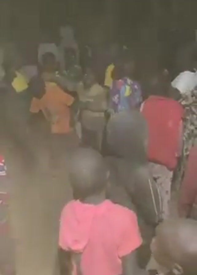 A group of people, predominantly children, are gathered outside, possibly in a village or rural area. The lighting is dim, suggesting it is evening or nighttime. There is a layer of dust or smoke hanging in the air, partially obscuring the scene. The people are dressed in a variety of casual clothes, with no clear pattern or uniformity. They appear to be milling around, with some moving and others standing still. The ground is dusty or sandy. The mood seems relatively calm and casual, though the unclear visibility makes it hard to assess the atmosphere definitively. There is some speech present.