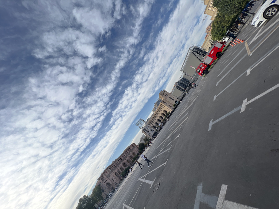 The image displays Republic Square in Yerevan, Armenia, captured with a diagonal perspective. The foreground consists of a large, dark asphalt surface marked with numerous white, T-shaped parking space outlines. A circular manhole cover is visible in the lower-left. In the mid-ground, a red fire truck, bearing the number "0822" on its side, is parked, facing towards the right. Adjacent to it on the right are several orange traffic cones, behind which a white official vehicle, likely a police car, is partially visible at the frame's edge. A large, temporary stage structure, constructed from metal scaffolding and white panels, is situated behind the fire truck. The background features the distinctive, light-colored stone buildings of Republic Square, characterized by multiple arched windows and classical architectural elements, identifying them as government structures and the History Museum of Armenia/National Gallery complex. Several individuals are present across the square; one person in a light shirt and dark pants walks leftward in the mid-left, while groups of people are seen near the vehicles on the right and along the building perimeters. The sky is partially cloudy, with prominent streaks of white clouds against a blue sky.