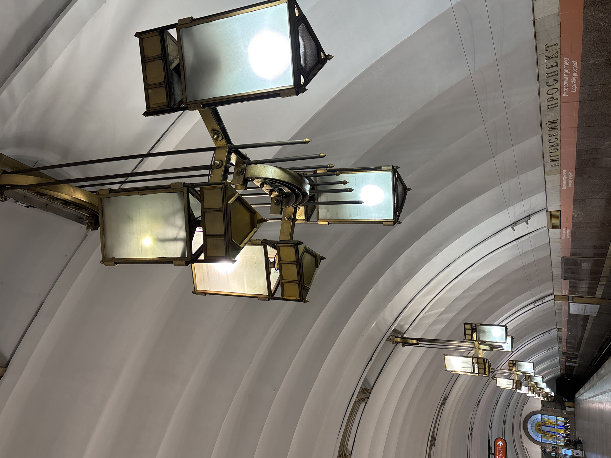 This is an interior shot of a metro station in Saint Petersburg, Russia. The ceiling has a curved, vaulted design with alternating white and light gray stripes. A series of ornate, vintage light fixtures hang from the ceiling, each with multiple rectangular lamps. On the right side of the image, there is signage in Russian and English, "Лиговский проспект Ligovsky prospekt," indicating the station's name. The platform and tracks stretch into the distance, with a few people visible in the background.