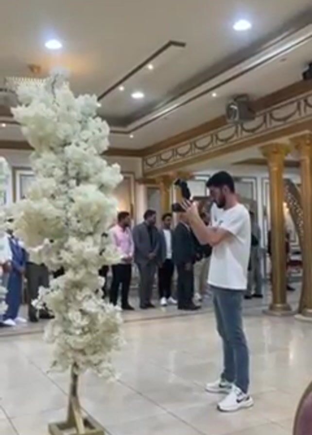 The video captures an indoor scene, likely a wedding or similar formal event, where a photographer is actively taking photos. The photographer, a young man with a beard, is wearing a white t-shirt and blue jeans. He is holding a DSLR camera with a flash attachment, and he is focused on a group of men in the background. The men are dressed in suits and shirts, suggesting a formal event. They stand relatively still, seemingly posing for the photos. A white floral tree-like decoration serves as a foreground element, partially obscuring the photographer and adding depth to the shot. The background reveals ornate details such as gold-trimmed columns, chandeliers, and decorative lighting, suggesting a lavish venue. The floor is tiled, and the overall ambiance is bright due to the lighting. There is a microphone stand and other equipment near the camera, hinting at audio recording or amplification for the event.