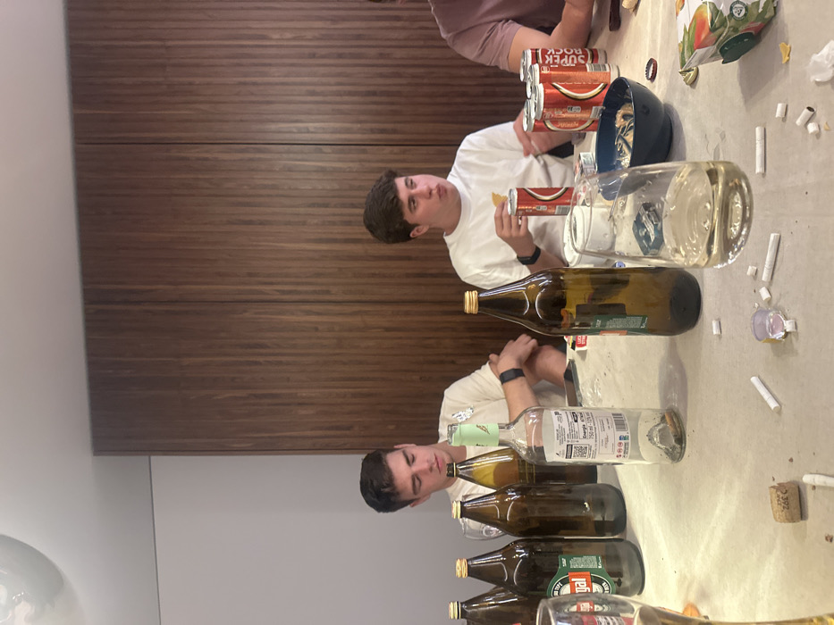 The image captures an indoor gathering featuring three young adult males seated around a cluttered table