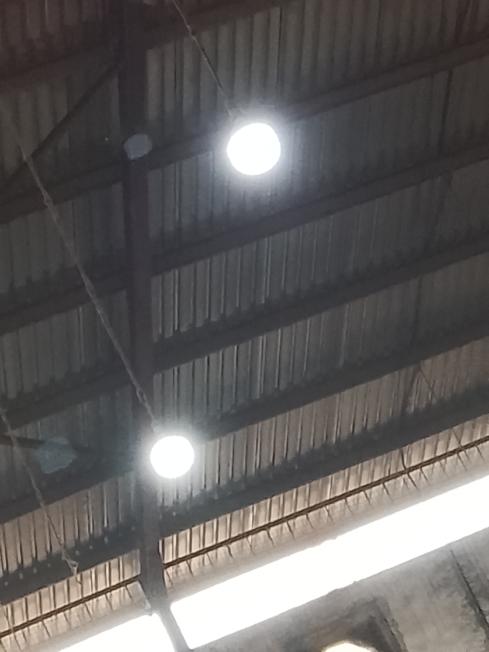 A low-angle shot captures a corrugated metal ceiling structure supported by beams. Two bright, circular lights illuminate the space. Suspension wires are visible, contributing to the industrial aesthetic. Lower sections of the image display significantly brighter, out-of-focus areas hinting at external light sources or structures beyond the ceiling. The overall tone is utilitarian, suggesting a warehouse or factory environment.