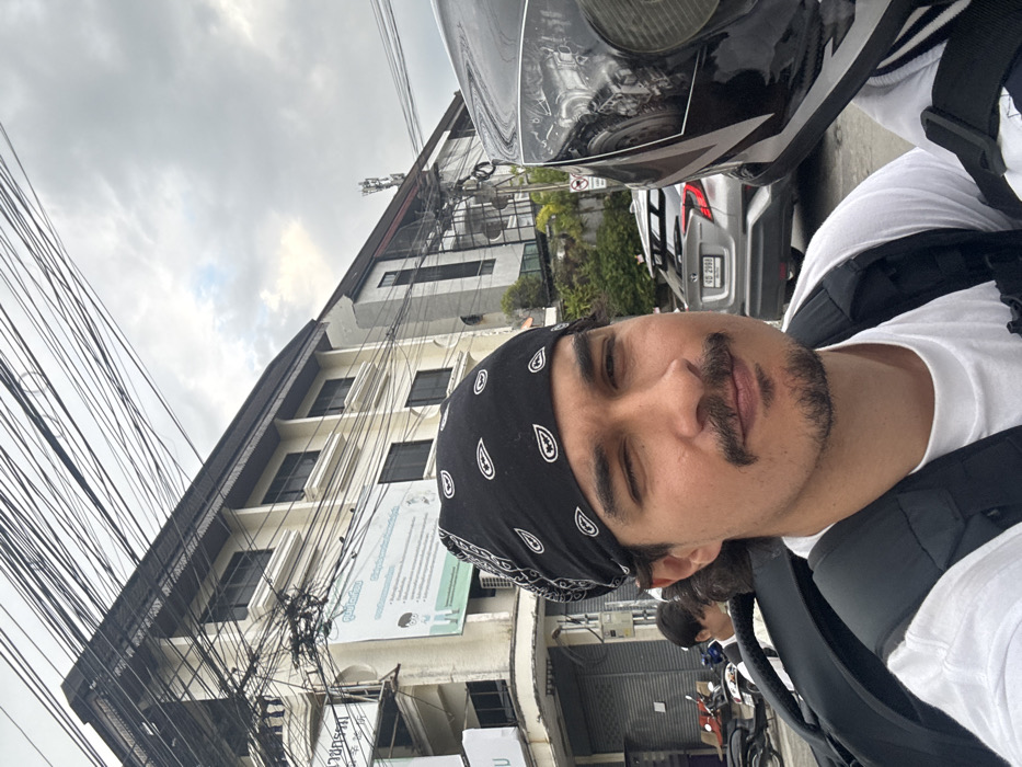 The image depicts a male individual in the foreground, facing the camera, on Chang Phueak Road, Si Phum, Mueang Chiang Mai District, Chiang Mai City Municipality, Thailand. The subject has brown skin, dark hair, a mustache, and a short beard, and is wearing a black paisley bandana, a white t-shirt, and a black tactical-style backpack. He maintains direct eye contact with the camera, exhibiting a slight squint in his left eye and a neutral expression. To his immediate right, a portion of a black motorcycle helmet with white and grey graphic designs is visible. In the midground, a silver Honda Civic hatchback with Thai license plate "4กฉ 2998" is parked, facing away. Multiple motorcycles are parked along the street to the left of the scene. Green foliage is visible behind the parked vehicle. The background consists of a dense urban environment under an overcast sky. On the left, a three-story, cream-colored building is prominent, identified as Chang Phueak Dental Clinic by a large banner displaying Thai script ("คลินิกทันตกรรม" - Dental Clinic, "ดูแลสุขภาพช่องปาก" - Oral Health Care) and an illustration. Adjacent to this building on the left, a vertical sign identifies the establishment as "ร้านขายยา ช้างเผือก" (Chang Phueak Pharmacy). To the right, a more modern, lighter-colored building with distinct vertical windows and rooftop communication antennas is visible. A dense network of black electrical and telecommunication wires crisscrosses the upper portion of the frame against the cloudy sky.