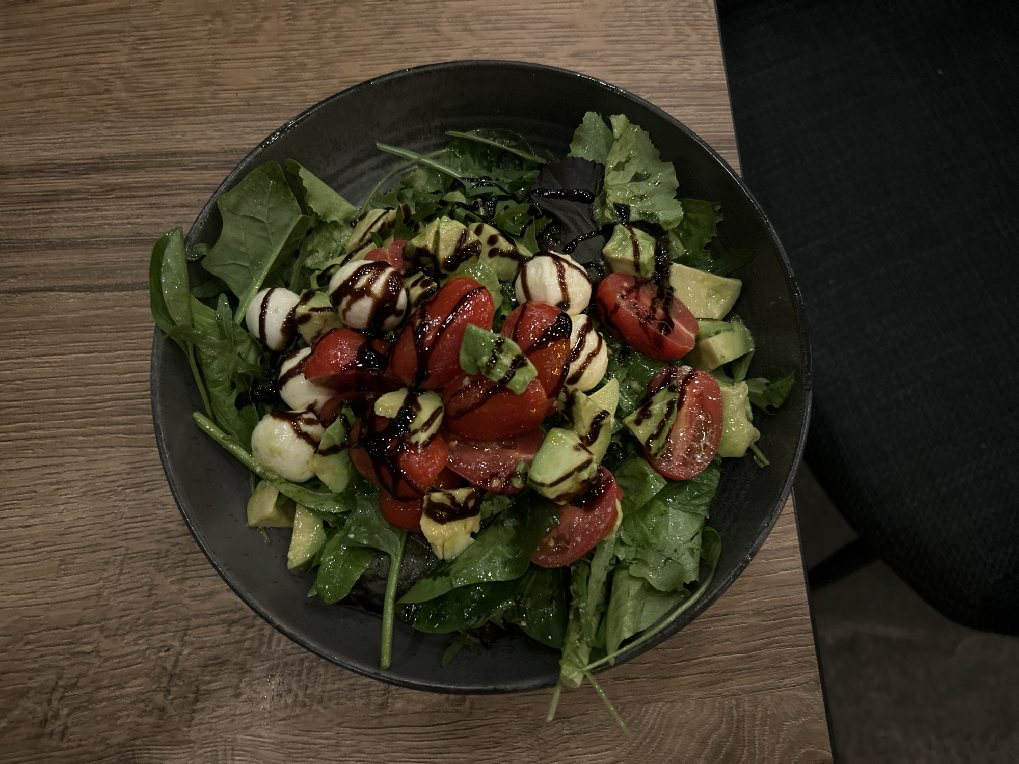 A top-down shot depicts a salad in a dark-colored bowl situated on a wooden surface. The salad consists of green leafy vegetables, halved cherry tomatoes, mozzarella balls, and avocado slices, all drizzled with a dark balsamic glaze. The wooden surface appears to be a table. To the right of the bowl is a dark surface, possibly a chair. The location is Goce Delchev, Bulgaria. No people are visible.