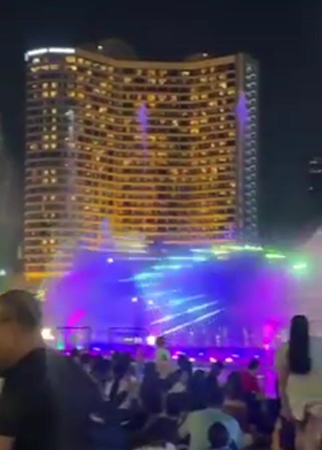 nighttime fountain show in front of a large building. The fountain is lit with a variety of colors, including green, blue, and purple. The water jets are arranged in different patterns, and some of the jets shoot high into the air. A crowd of people is watching the show. Many people are recording the show with their phones. The large building behind the fountain is lit up with many lights.