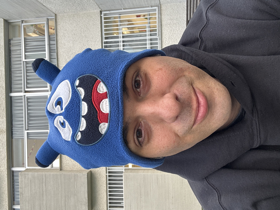 A medium-close-up photograph, taken in Tel-Aviv, Israel, depicts a male individual, appearing to be in his 20s to 40s, centered in the frame. He is looking directly at the camera with a subtle, closed-lip smile. The individual wears a bright blue fleece beanie hat featuring an embroidered cartoon face with large white eyes, an open mouth displaying white teeth, and a red tongue; two small, dark-tipped protrusions extend from the top of the hat. He is also wearing a dark, possibly black, hooded sweatshirt, which is visible around his neck and shoulders. The background consists of a light-colored, multi-story building facade, likely concrete or stucco. Visible architectural elements include multiple rectangular windows. Upper windows are fitted with light-colored curtains, while lower windows are equipped with white vertical security bars. A concrete ledge is visible on the left side of the frame. The scene is illuminated by ambient daylight.