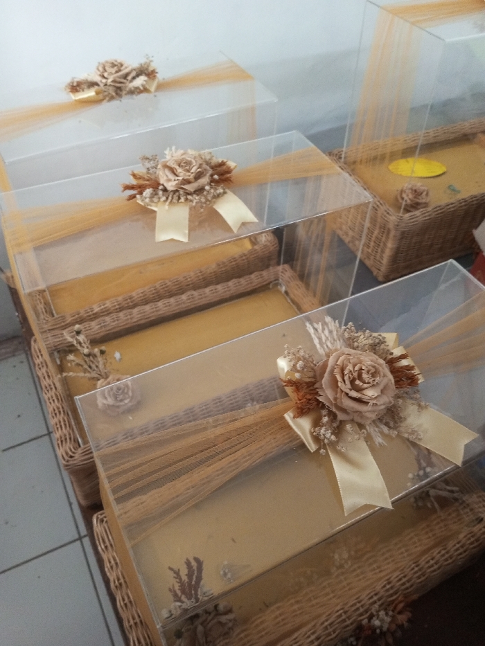 Several square boxes, likely gifts, are stacked. They feature clear acrylic tops adorned with beige roses, small sprigs, and silky ribbon bows. The boxes have woven rattan bases lined with a golden material. A sheer, golden tulle-like fabric is draped across the tops, adding a soft, decorative touch to each box. The arrangement is close, and the focus is on the boxes' details and decorations.