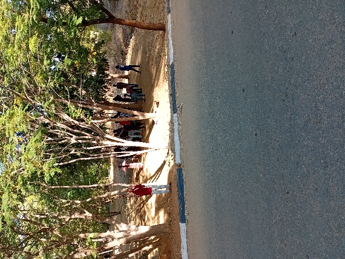 The scene depicts an outdoor area in Dabawa, Nigeria. In the foreground, an asphalt road runs horizontally across the lower third of the image. A curb, painted white with a blue or dark band, separates the road from a dirt and gravel area. Beyond the curb, numerous trees with green foliage and bare branches create a shaded environment. Sunlight illuminates parts of the ground and foliage, indicating daytime. Approximately twelve individuals are present within the treed area. A male subject, wearing a red short-sleeved shirt and light-colored trousers, stands on the dirt path to the left, facing towards the right side of the frame. Further into the treed area, a group of approximately ten individuals is gathered. They are standing in various positions, some appearing to be in conversation or observing. One person wears a light pink/peach garment. On the far right, a solitary individual in a blue top is observed walking towards the right, away from the main group. The ground beneath the trees is composed of dry earth and sparse vegetation.
