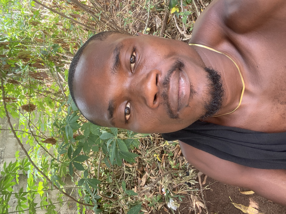 An adult male of dark complexion is featured in a close-up outdoor portrait, facing the camera with a neutral to slight smile. He possesses short dark hair, a dark mustache, and a goatee beard. The individual is bare-chested, adorned with a thin gold-colored chain around his neck, and a black fabric is draped over his left shoulder. The background consists of dense green foliage, notably cassava plants, alongside various other shrubs and dry leaves. A concrete wall is partially discernible through the vegetation in the upper-left quadrant. The ground beneath is reddish-brown soil, covered with fallen leaves and minor debris. The scene is illuminated by bright natural daylight, consistent with an outdoor setting during the day in Owerri, Nigeria.