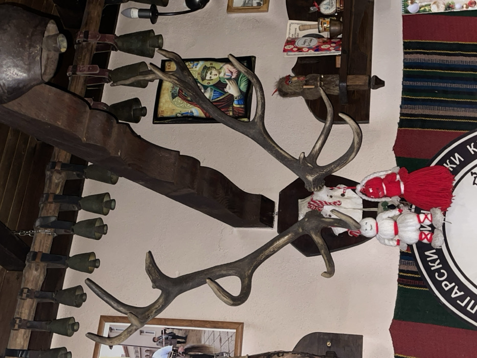 An interior scene in Kalugerovo, Bulgaria, features a rustic, traditional aesthetic. A large set of deer antlers, mounted on a dark wooden plaque, dominates the light-colored wall. Above, numerous antique-style bronze bells of varying sizes hang from a prominent dark wooden beam that traverses the wooden-planked ceiling. To the left of the antlers, a framed photograph depicts an outdoor village scene with individuals and a horse. To the right, an Orthodox Christian icon portraying the Virgin Mary and Child is mounted on the wall, beneath another section of the wooden beam from which more bells are suspended. Below the antlers, two handmade dolls, one primarily white and the other red, resembling Martenitsa figures, are displayed. The lower wall is covered by a colorful striped woven textile, partially obscuring a circular object with Cyrillic text. A small wooden shelf to the right holds a brown, furry figurine, a small bell, and other decorative items. An exposed electric light bulb is visible on the far right.