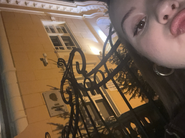 A low-angle, nighttime photograph captures the exterior of the Sava Dobroplodni House Museum in Sliven, Bulgaria. The building presents a yellow-painted facade with a decorative white cornice along the roofline and white-framed, multi-pane windows. Mounted on the wall is a light-colored rectangular plaque featuring a dark bust silhouette and the inscription "САВА ДОБРОПЛОДНИ". A white security camera is positioned above this plaque. The foreground is partially obscured by an intricate, dark wrought iron fence or gate with curvilinear designs. Through the fence, remnants of yellow street signage are visible, including partial text such as "ПЕТРОВА" and "ЗДРАВЕЦ". The upper right quadrant of the image displays a partial, close-up view of an individual's face, specifically the right eye with prominent dark eyeliner, the nose, and the upper lip, which appears glossed and slightly open. A silver hoop earring is visible in what appears to be the individual's left earlobe. The scene is illuminated by artificial light sources, casting a warm, yellowish glow across the building.