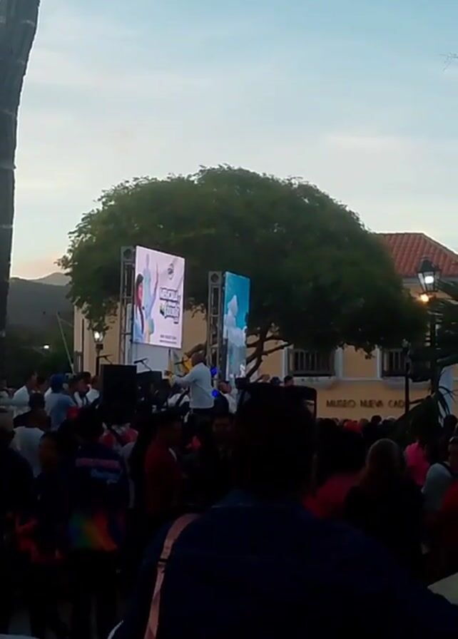 A large crowd gathers for an outdoor event in front of a yellow building labeled "Museo Nueva Cadiz". A stage is set up with two large screens displaying visuals. A man in white stands on the stage, seemingly addressing the crowd. The sky is a clear blue, and a large tree provides a natural backdrop to the event. The atmosphere appears lively, with the crowd facing the stage. The event is taking place in a public square or park.