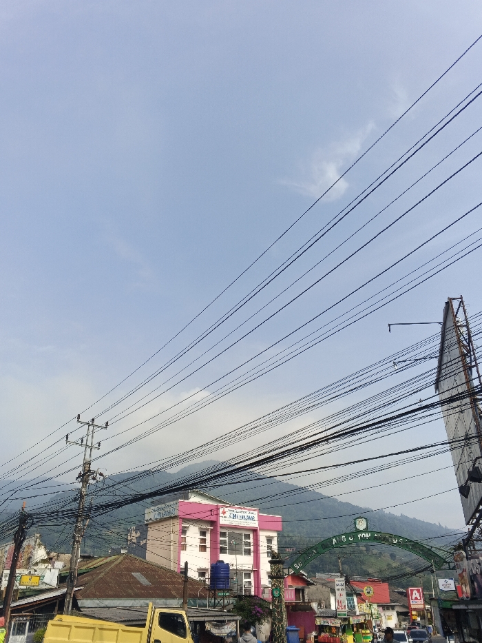A daytime wide shot captures an active street scene at the base of a mountain range in Unknown, Cambodia. The sky above is light blue with scattered thin white clouds. Numerous black electrical and communication cables dominate the upper two-thirds of the frame, running diagonally across the sky. In the mid-ground, a two-story building with a pink upper facade and white lower facade is centrally positioned, bearing the text "PUSKESMAS SELIARUM" on its front. To the immediate right of this building, a blue water tank is visible on a rooftop. Further to the right, a prominent green archway spans the roadway, inscribed with "SELAMAT DATANG DI CIBULAN". The far right edge of the frame includes a partially visible metal billboard structure. The foreground displays various low-rise commercial structures and market stalls with corrugated metal roofs and colorful awnings. A yellow truck's cab is partially visible on the far left. A wooden utility pole heavily laden with multiple transformers and a dense cluster of black wires stands prominently to the left of the pink building. Several individuals are present on the street level, appearing to walk or stand, though specific actions are obscured. Vehicles are minimally visible on the roadway, indicating traffic. The background features large, green, forested mountains under a slightly hazy sky. The environment suggests a commercial or public service area situated in a mountainous region.