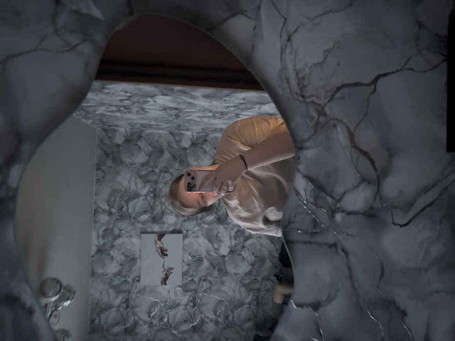 An individual is captured in a mirror selfie within an indoor residential setting in the city of Ольховка, Russia. The subject, a person with light-colored hair, wears a plain light brown t-shirt and a dark bracelet on their left wrist. They are holding a light-colored smartphone, equipped with multiple camera lenses, in their right hand, directing it towards the mirror to photograph their reflection. The phone partially obscures the subject's face, with a notable light flare visible on its surface near their left eye. The mirror itself is irregularly shaped, with a frame featuring a distinct grey and white marbled pattern. Reflected in the mirror is the room's background: the wall is adorned with a similar grey and white abstract marbled design. A rectangular piece of artwork, depicting the iconic hands from Michelangelo's "The Creation of Adam," is centrally mounted on this wall, positioned to the left of the subject's reflection. A portion of a white ceiling with a single light fixture is visible in the upper left corner of the reflection. To the right, a dark brown vertical structure, possibly a door frame or furniture, is reflected. An additional, indistinct dark object is partially visible in the lower-left background, behind the subject's reflected arm.