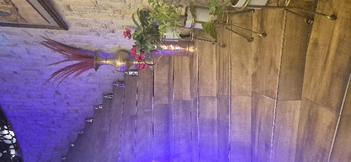 A wall showcases textured, earthy tiles interspersed with decorative elements. A vase holding red feathers and flowers, illuminated by a blue light, adds a vibrant touch. Above, a green potted plant sits on a metallic shelf, complementing the overall warm color scheme of the wall. The composition creates a visual blend of nature and artistic decor.