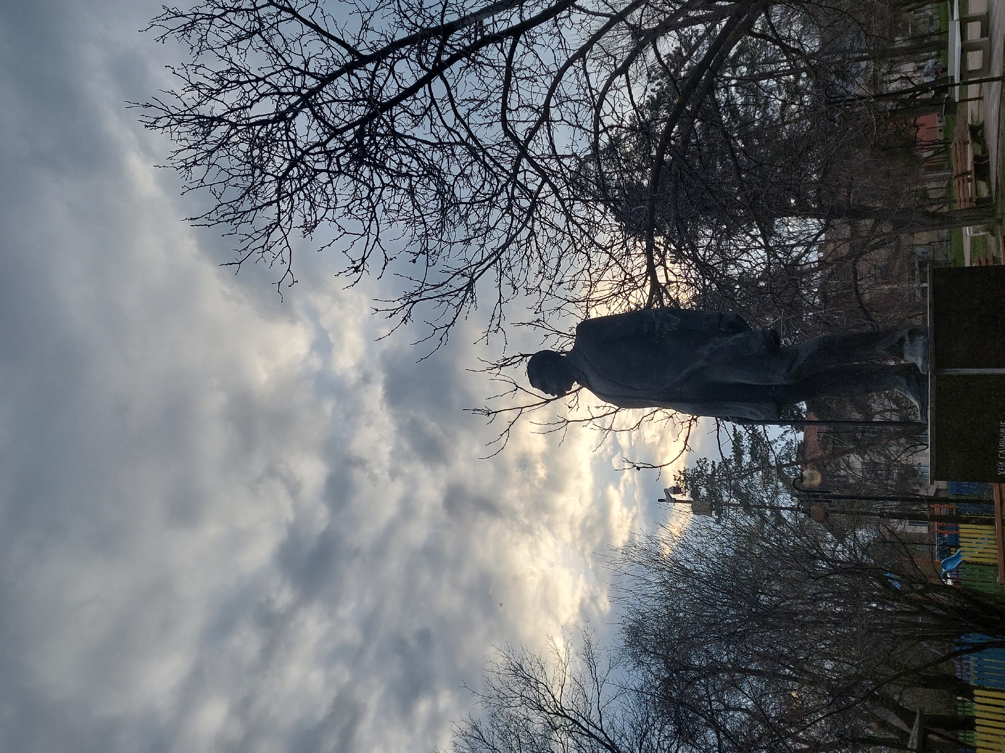 A full-body statue of a male figure, rendered in dark material, stands prominently on a dark, rectangular pedestal in a park in Slivnitsa, Bulgaria. The figure, dressed in what appears to be a suit or overcoat, is oriented with its back partially to the observer, looking towards the right side of the frame. The sky above is overcast with a mix of gray and white clouds, with a distinct bright, yellowish-white glow on the horizon to the right, indicating a low sun obscured by clouds. Numerous bare deciduous trees with intricate branch patterns frame the scene, primarily silhouetted against the sky. A multi-colored picket fence (yellow, blue, green, red segments) marking a children's playground, which includes a blue slide, is visible in the lower-left background. A black lamppost with two luminaires is situated behind the statue and to its left. Further into the park on the right, park benches and a white outdoor table are discernible on paved ground beneath more bare trees. Distant buildings are vaguely visible through the skeletal tree branches. No human figures are present. The lighting suggests either early morning or late afternoon.