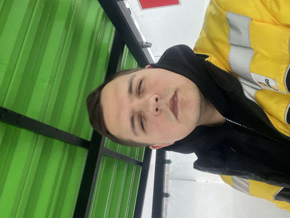 An adult male is depicted in a medium close-up, positioned under a bright green corrugated metal canopy supported by black structural beams. He has dark, short hair styled upwards, slight stubble on his upper lip and chin, and his eyes are partially closed. He is wearing a black hooded sweatshirt beneath a yellow and black puffer jacket that features horizontal grey reflective strips across the chest and upper sleeves. A partial white logo or text is visible on the right chest area of the yellow jacket. To the left and right of the individual, blurred translucent panels extend downwards, revealing a bright white, indistinct background with a red rectangular object partially visible on the far right. The scene is located in Lupanovo, Russia.