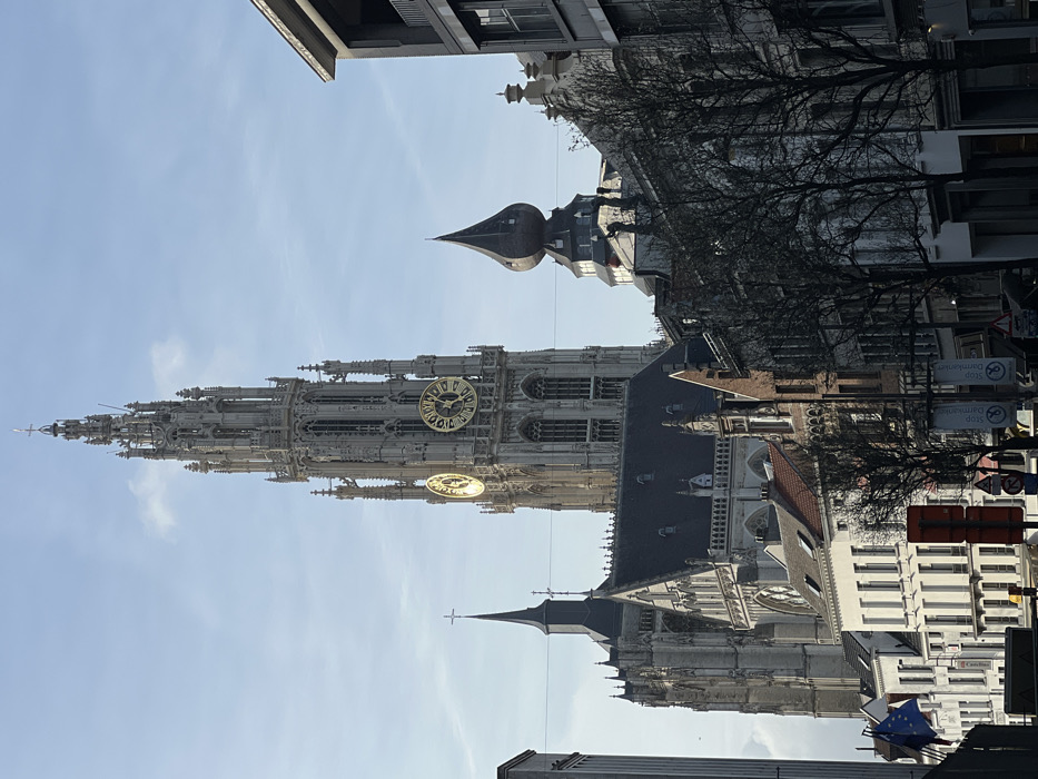 The image depicts a street view in Antwerp, Belgium, dominated by the Cathedral of Our Lady (Onze-Lieve-Vrouwekathedraal)