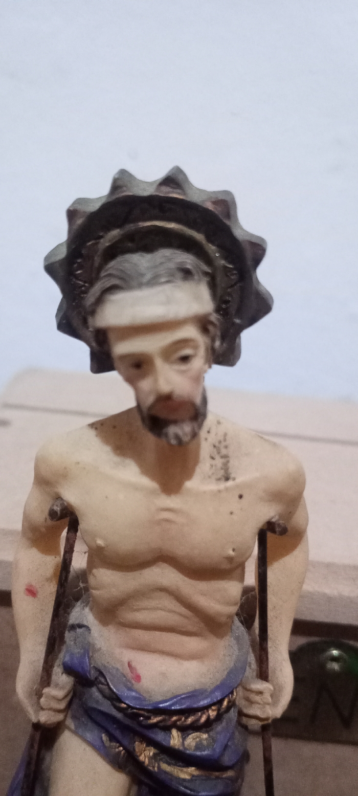 A painted figurine depicts a man with a beard, headwear, and a halo-like object above his head. He's shirtless, displaying sculpted abdominal muscles. There are markings, possibly painted to resemble wounds or imperfections, on his body. He's holding two rods or staves. The lower portion of his body is draped in a blue cloth with gold accents. The figurine is placed on a wooden surface against a muted background.