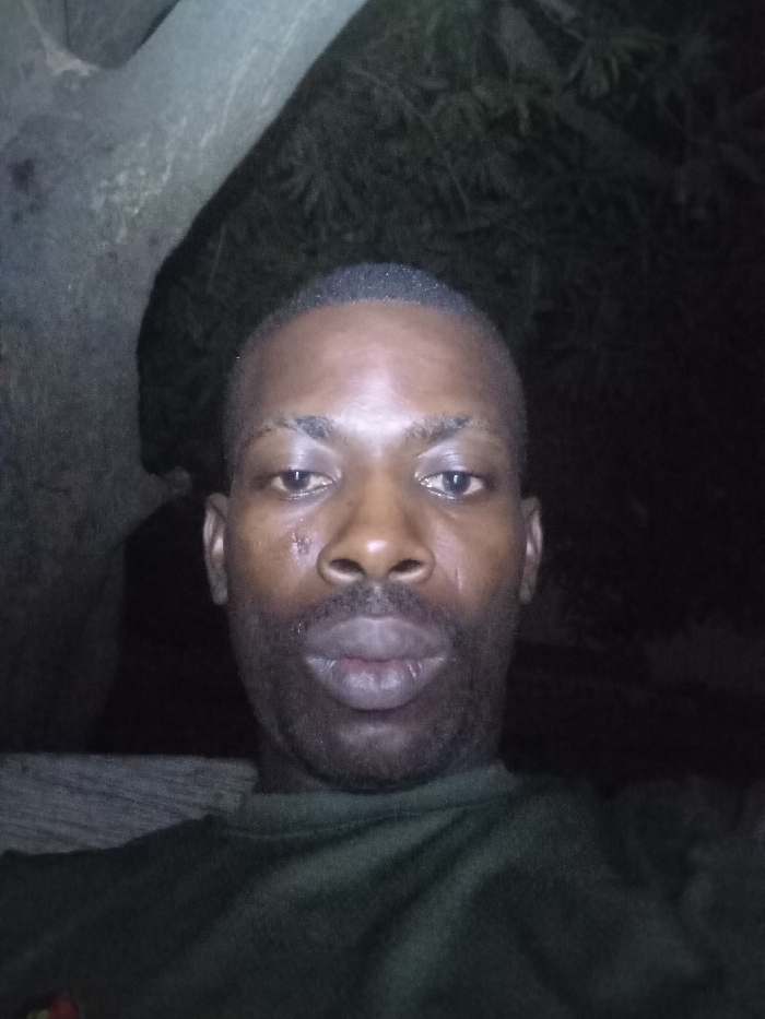 A close-up self-portrait of a dark-skinned man with a shaved head and dark stubble. The lighting is dim, casting shadows across his face. There's a visible abrasion near his left eye. He wears a dark, nondescript shirt. The background is out of focus, but suggests a tree branch and possibly some vegetation, giving the impression of being outdoors at night.