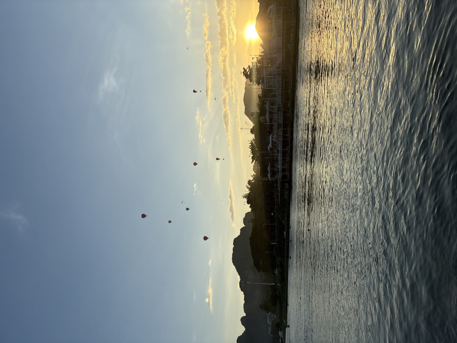 The image presents a wide view of the Nam Song River in Vang Vieng, Laos, during sunset. The lower half of the frame is occupied by the river, its surface displaying moderate ripples and reflecting intense golden light from the low-angle sun. The setting sun, a brilliant golden orb, is positioned on the far right horizon. The middle ground features a distinct riverbank lined with dense green foliage and numerous low-rise commercial structures, likely restaurants or guesthouses, some with multi-tiered platforms extending towards the water. In the background, to the left, sharply defined dark karst limestone mountains rise prominently against the sky. Towards the right, similar mountainous terrain is partially obscured by atmospheric haze. The sky transitions from a pale blue at the zenith to a warm orange and yellow gradient near the horizon, with scattered, wispy clouds. Ten red-colored hot air balloons are distributed across the sky at various altitudes. Concurrently, at least four paragliders, identifiable by their distinct canopy shapes, are also airborne. Indistinct dark shapes are faintly visible on the water's surface in the mid-ground. No clearly identifiable human figures are discernible on the riverbank, in the structures, or within the aerial craft, though their presence is implied by the activities.