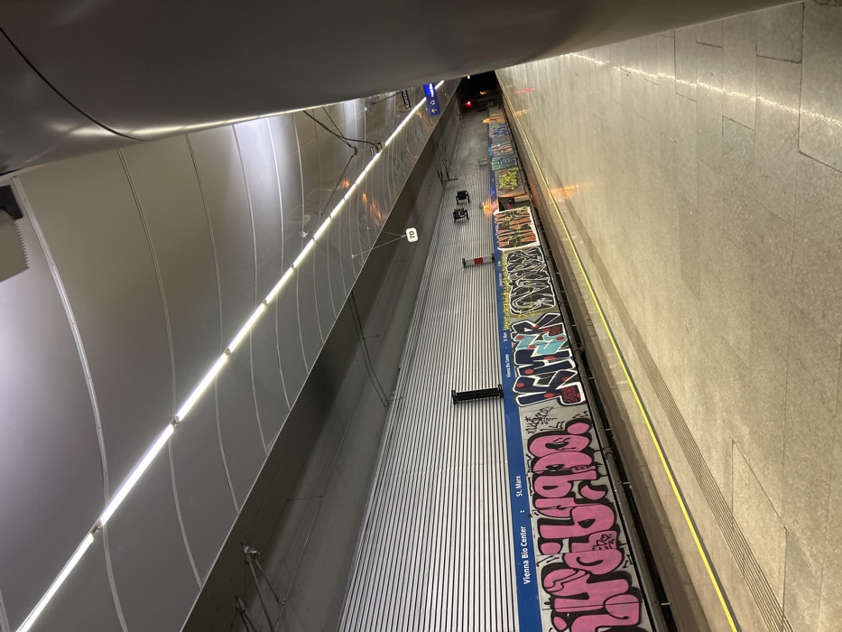 The image displays an underground transit station platform identified as "Vienna Bio Center :: St