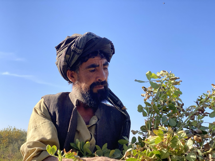 An Afghan man with a beard and turban stands in a field, holding leafy green plants