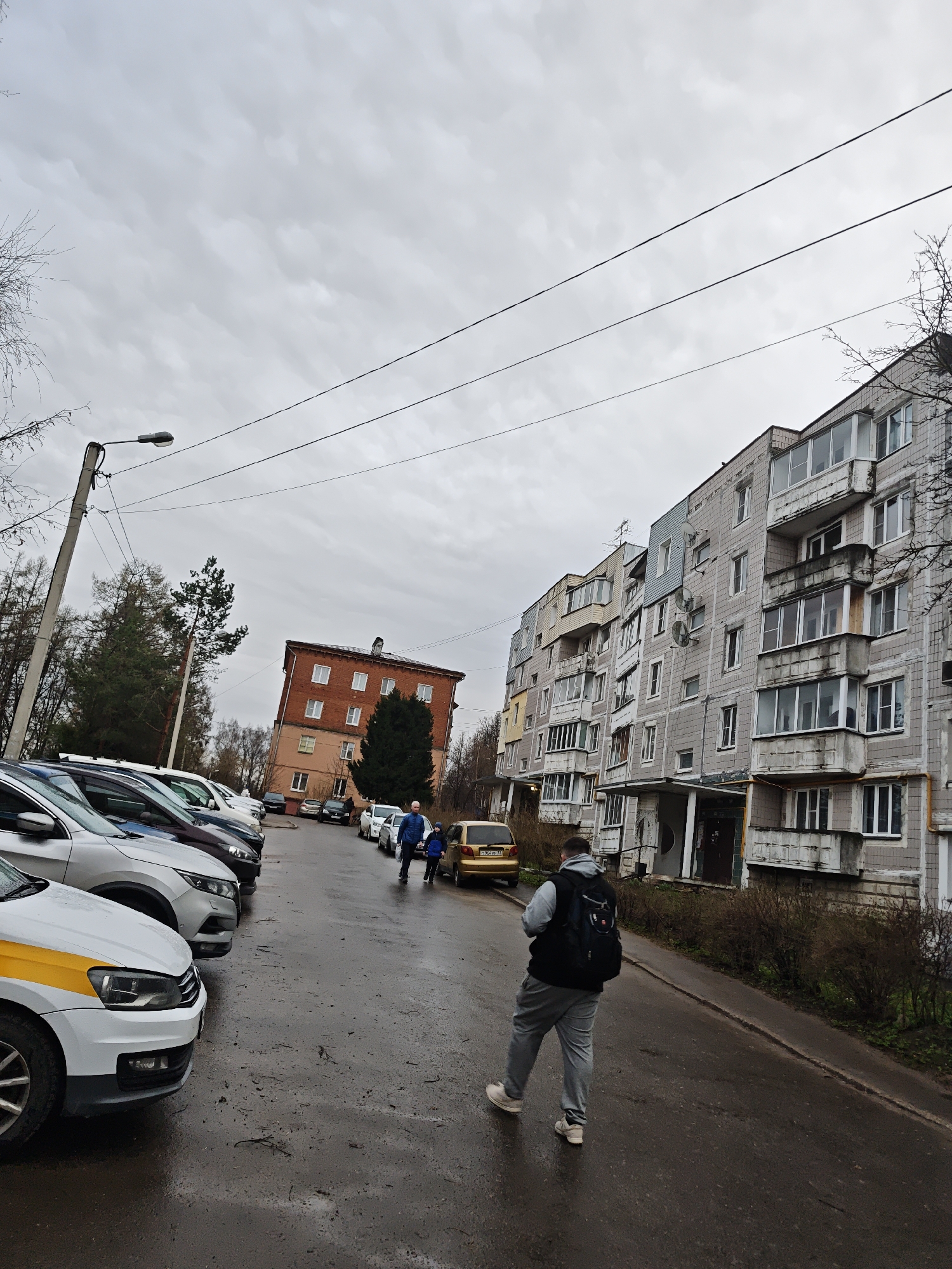 The image depicts a street scene in what appears to be a residential area of Yakhroma, Russia, indicated by the Cyrillic text on the license plate of a gold-colored car. The weather is overcast, casting a diffused light on the wet pavement. A man wearing a gray tracksuit and a black backpack is walking away from the viewer, down the street. In the distance, a man and child are walking towards the right side of the frame. Parked cars line the left side of the street. The majority of the cars are silver or white. Buildings on both sides of the street dominate the scene. The building on the left is a red brick structure, while the building on the right is an apartment building with grey and white cladding. Power lines stretch across the sky. A leaning light pole is visible on the left. The ground is wet.