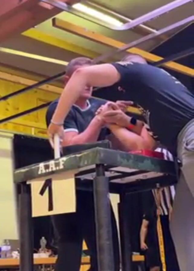 Two men are engaged in an arm wrestling match at a table labeled "1 A