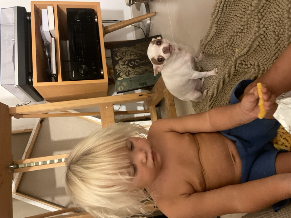 This image depicts an indoor scene in Pardes Hana-Karkur, Israel. A young child, appearing to be a toddler with disheveled blonde hair, fair skin, and wearing blue shorts, is seated on a light-colored tiled floor. The child is shirtless and holds an orange, elongated snack item in their right hand, while additional similar snacks are visible on the floor next to a metallic bag. To the child's right, a small, short-haired chihuahua dog, primarily white with light brown markings around its eyes and ears, sits on a textured, light brown rug, facing forward with its mouth slightly ajar. In the background, a wooden easel stands partially obscured behind the child. To the right of the child, a light wood stereo cabinet on slender legs holds a turntable with a clear dust cover on its top surface. The upper shelf of the cabinet contains various stacked items, and the lower shelf houses a black Pioneer audio receiver. A large record album cover, displaying stylized artwork and the word "GOLD," leans against the wall beneath the cabinet.