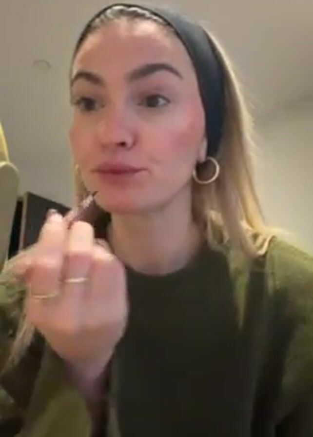 A woman with blonde hair, fair skin, and wearing a black headband and green sweater is applying lip liner