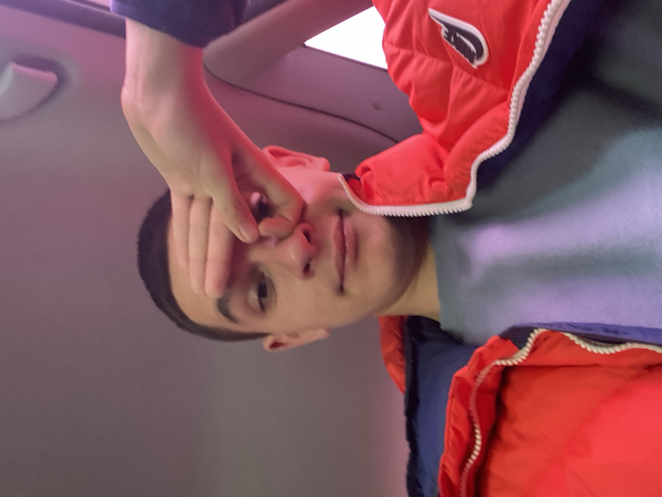 A young adult male, with short dark hair and a neutral expression, is depicted looking directly at the camera. He is wearing a light-colored crew-neck shirt beneath a red puffer jacket with navy blue lining and white trim. A white and black patch logo is visible on the upper left sleeve of the jacket. A second individual's hand, entering the frame from the right, is positioned over the male subject's face, forming an "OK" gesture with the thumb and index finger around his left eye, while the remaining fingers extend across his forehead. The scene is illuminated by artificial light, casting a pink and purple hue, particularly on the right side and ceiling. The background indicates an interior space, specifically the cabin of a vehicle, evidenced by a light-colored headliner and an overhead grab handle or light fixture. A bright white light source is visible through an opening on the far right. No visual identifiers are present to confirm the specific location within the city of Stara Zagora, Bulgaria.